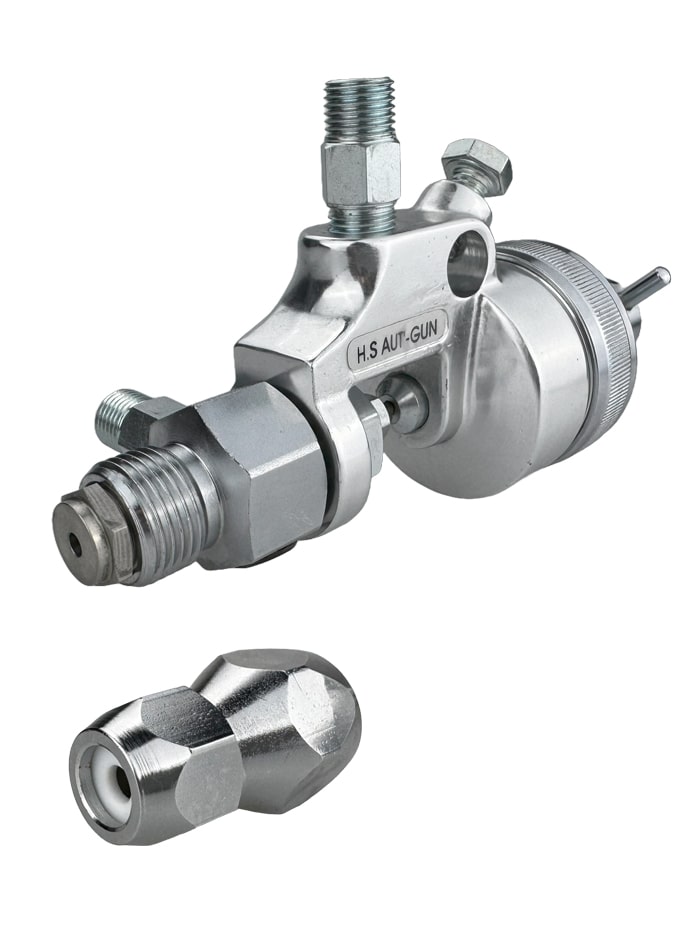 Благодаря высокой мощности распыления его можно устанавливать на все типы электрических и безвоздушных распылителей. Разница в том, что он не ручной, как другие краскопульты, а работает автоматически, подключаясь аппарату или роботу, и равномерно распыляет краску.